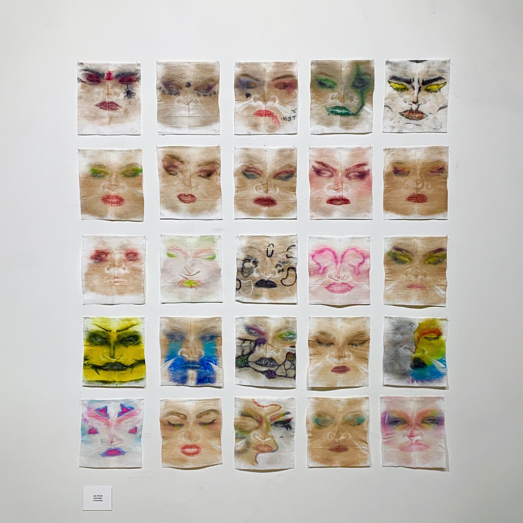 "Imprinted" is a series of facial impressions captured on makeup-removing wipes, transforming a temporary art into a lasting, tangible piece. Jay explored cosmetics in depth during the 2020 pandemic. Each wipe holds the pigments of products, his facial shape, and the hours spent to create a look. This piece later won first place in the 2021 Juried Student Showcase at Coastal Carolina University.